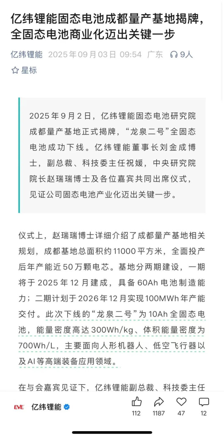 9月3日,亿纬锂能官方公众号发文称,9月2日公司固态电池研究院成都量产基地正式揭牌,“龙泉二号”全固态电池成功下线。该基地总面积约11000平方米,全面投产后年产能近50万颗电芯,分两期建设:一期2025年12月建成,具备60Ah电池制造能力;二期2026年12月实现100MWh年产能交付。