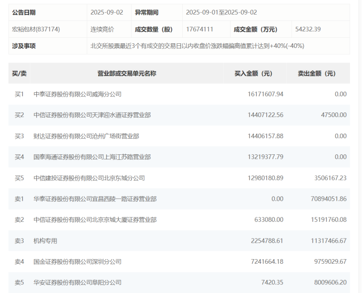 来自北交所官网的交易公开信息显示,推动宏裕包材近期股价异常的资金多来自游资。